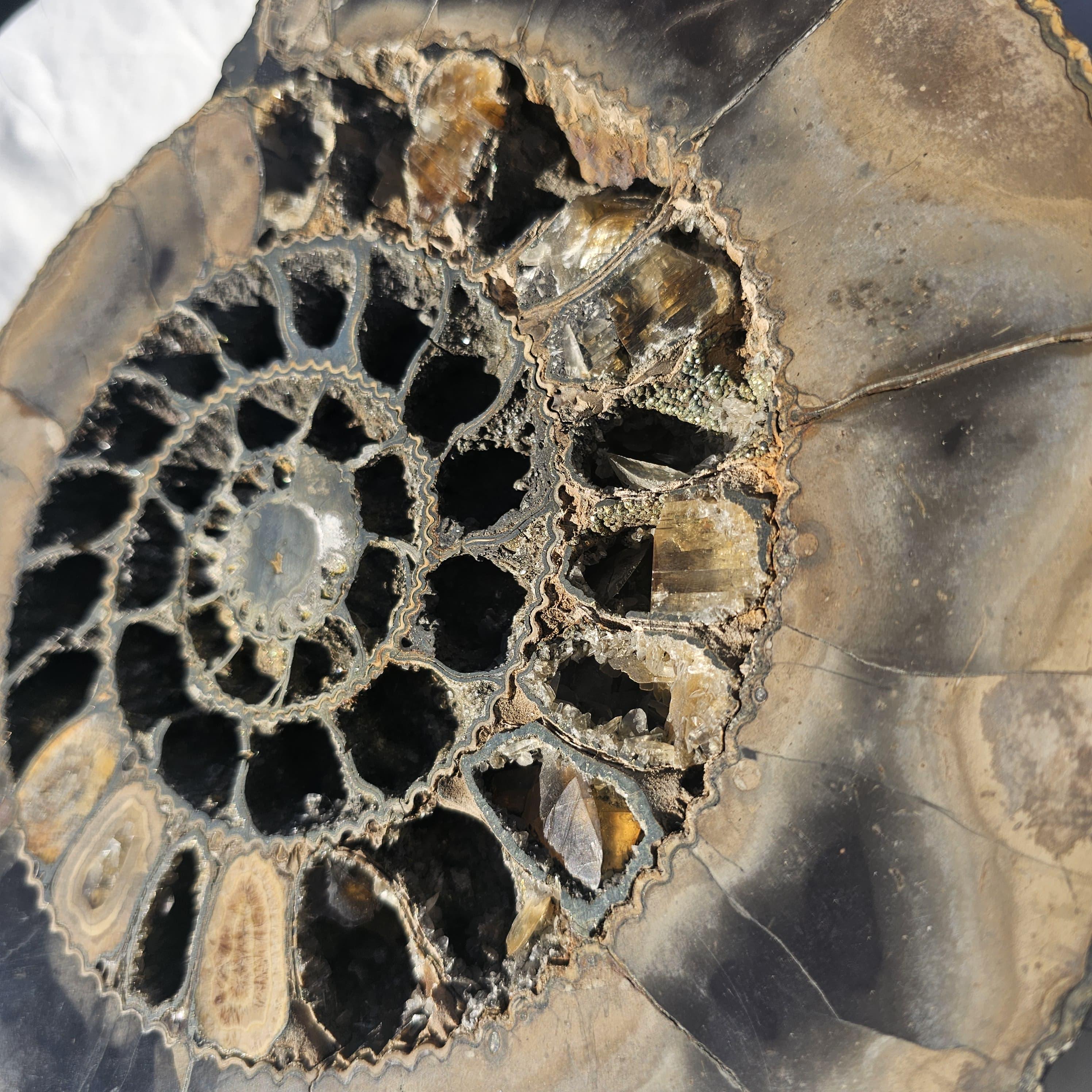 Over millions of years, the original shell was replaced with pyrite, creating the beautiful golden crystallization you see today. Each chamber is naturally defined, showcasing intricate spiral geometry formed more than 150 million years ago during the Jurassic period.