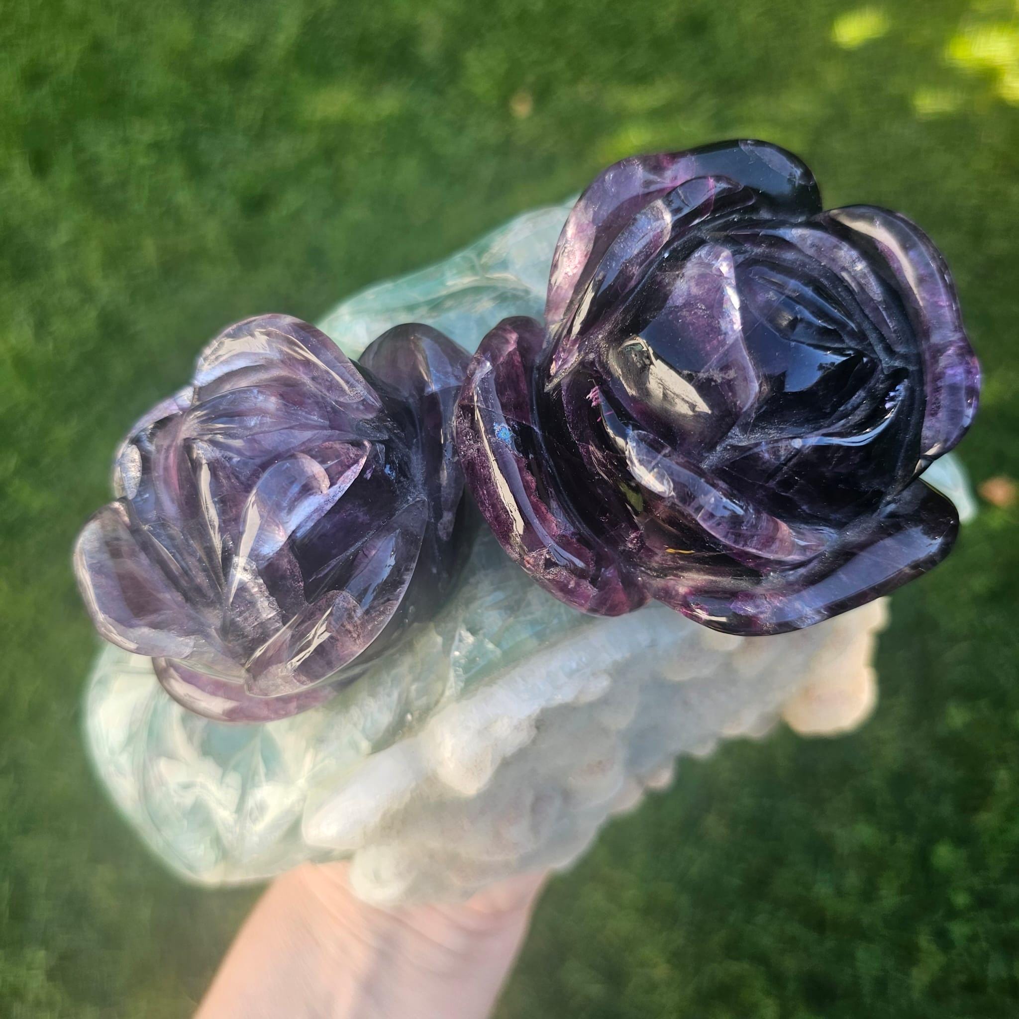 Discover the enchanting beauty of genuine Fluorite, expertly carved into a delicate rose sculpture that brings elegance and positive energy to any space. This exquisite piece showcases vibrant purple and green hues with subtle Calcite accents, making it a stunning blend of artisan craftsmanship and natural gemstone beauty.