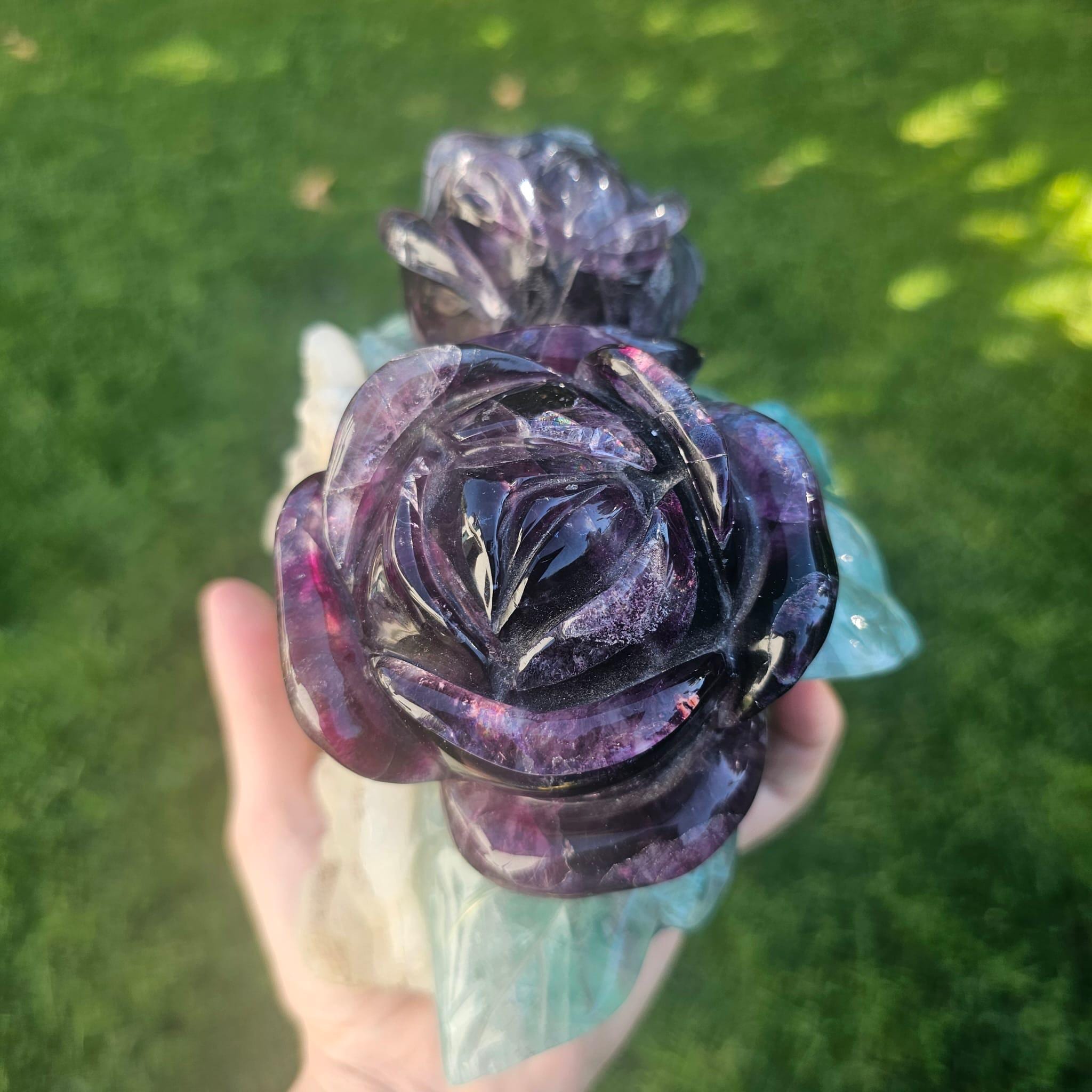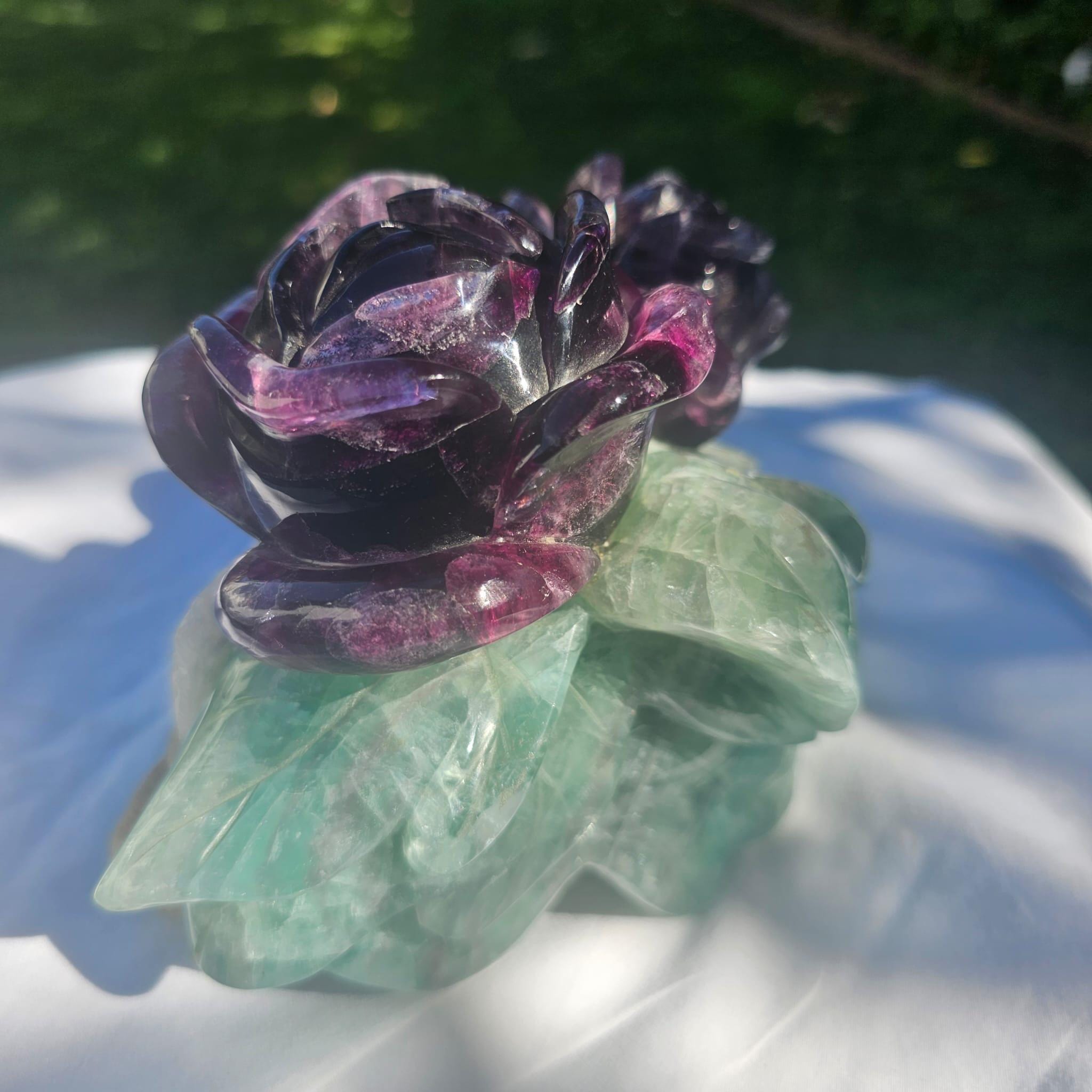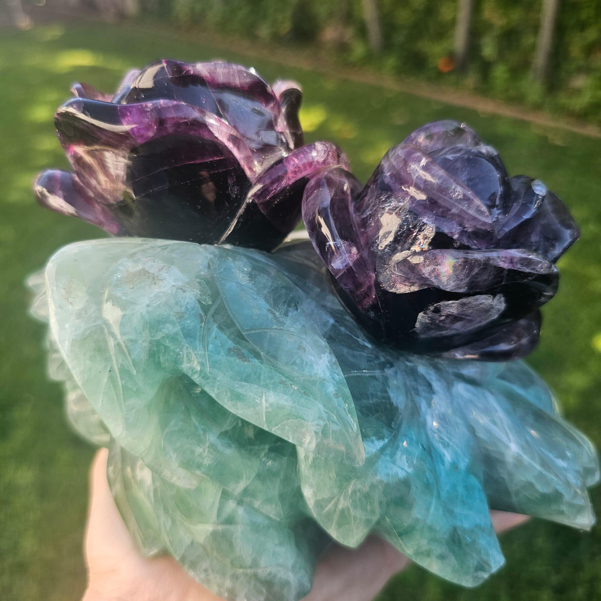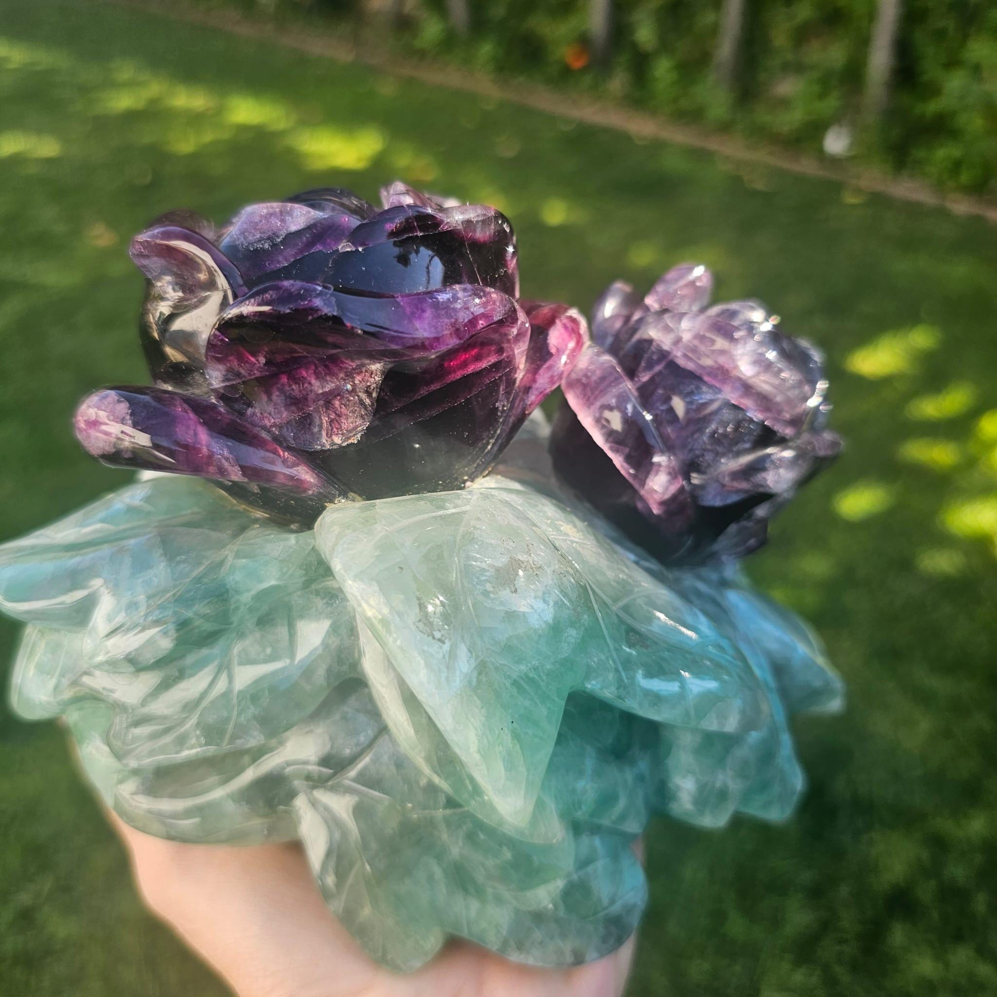 🌿 Hand-Carved Fluorite Rose Crystal Sculpture – Natural Purple & Green Gemstone Décor & Healing Gift