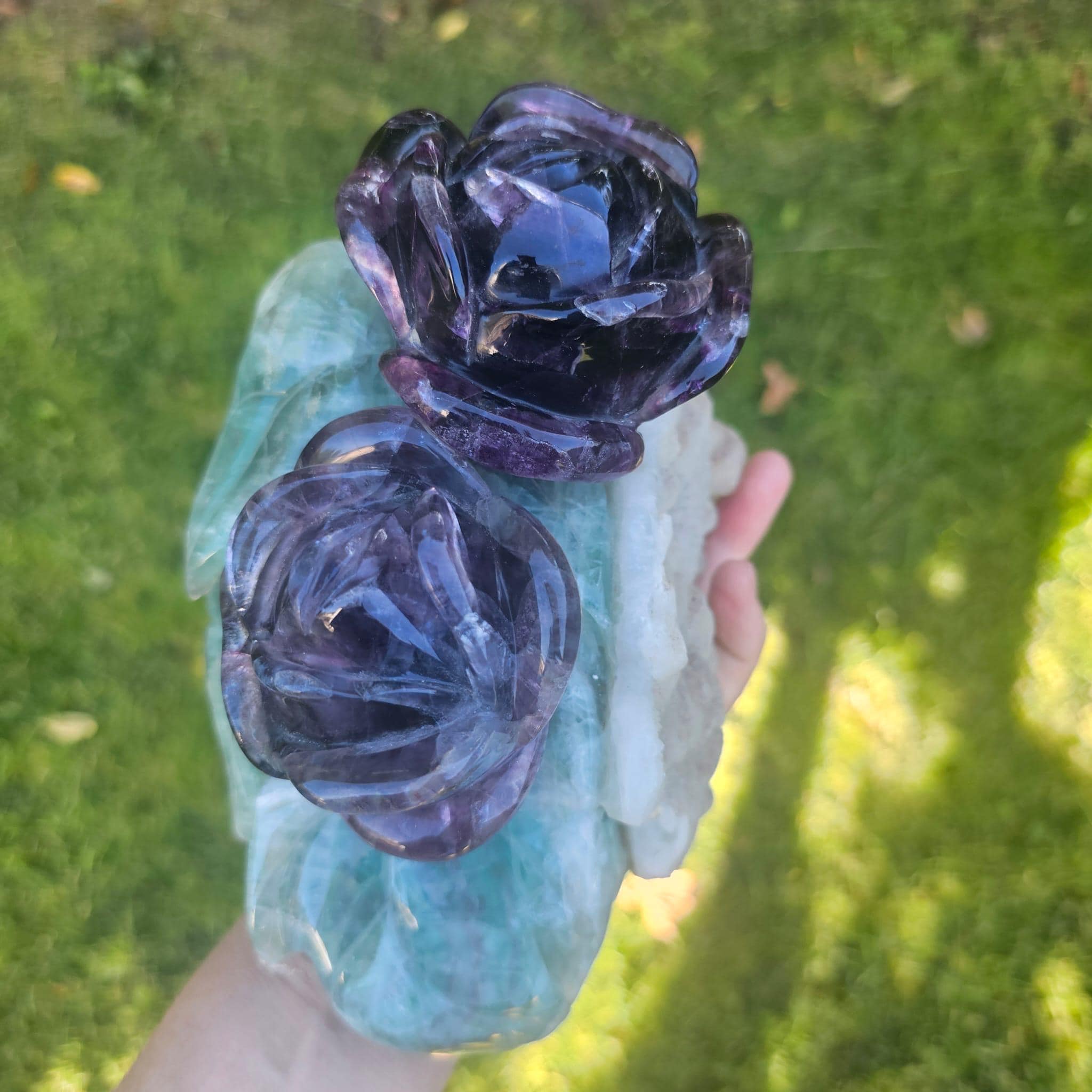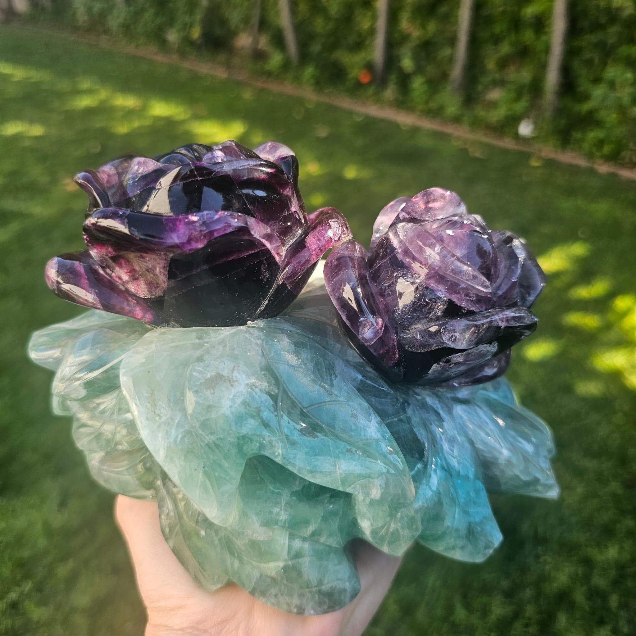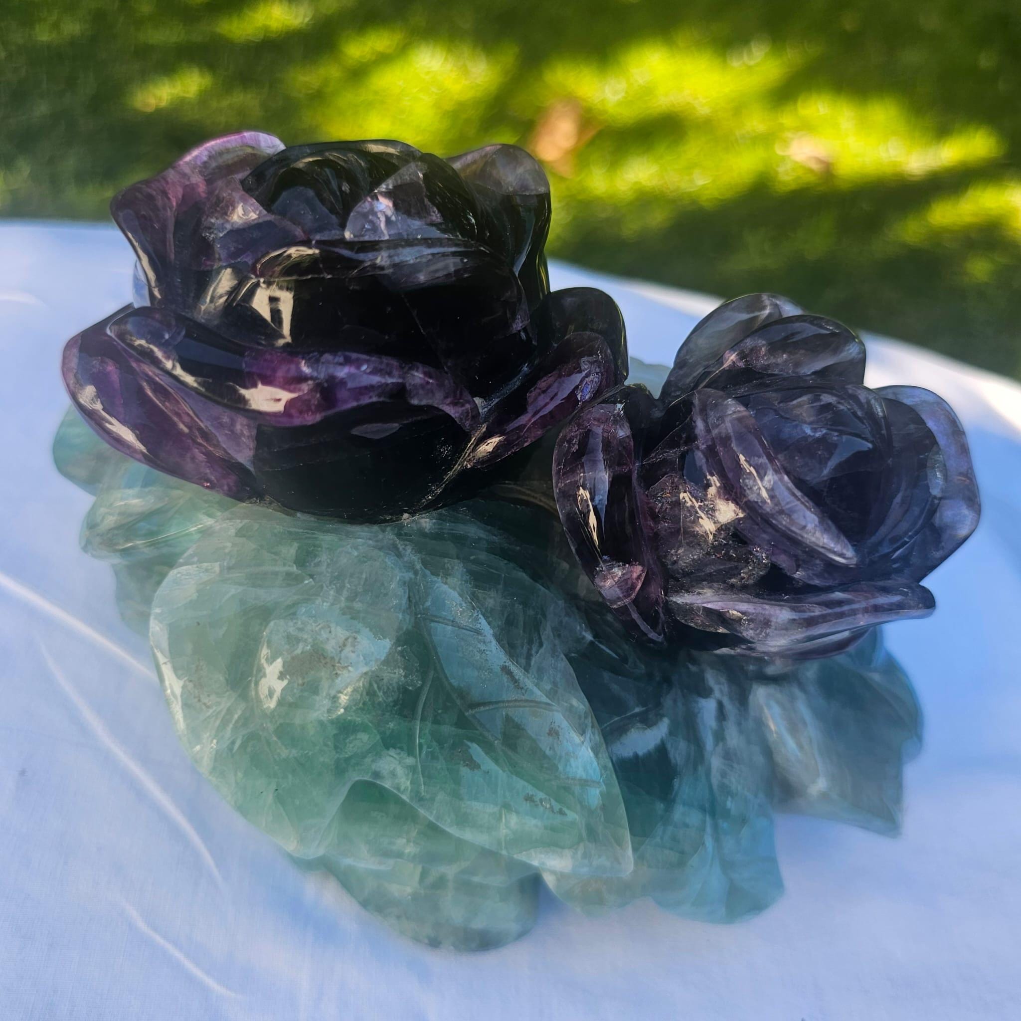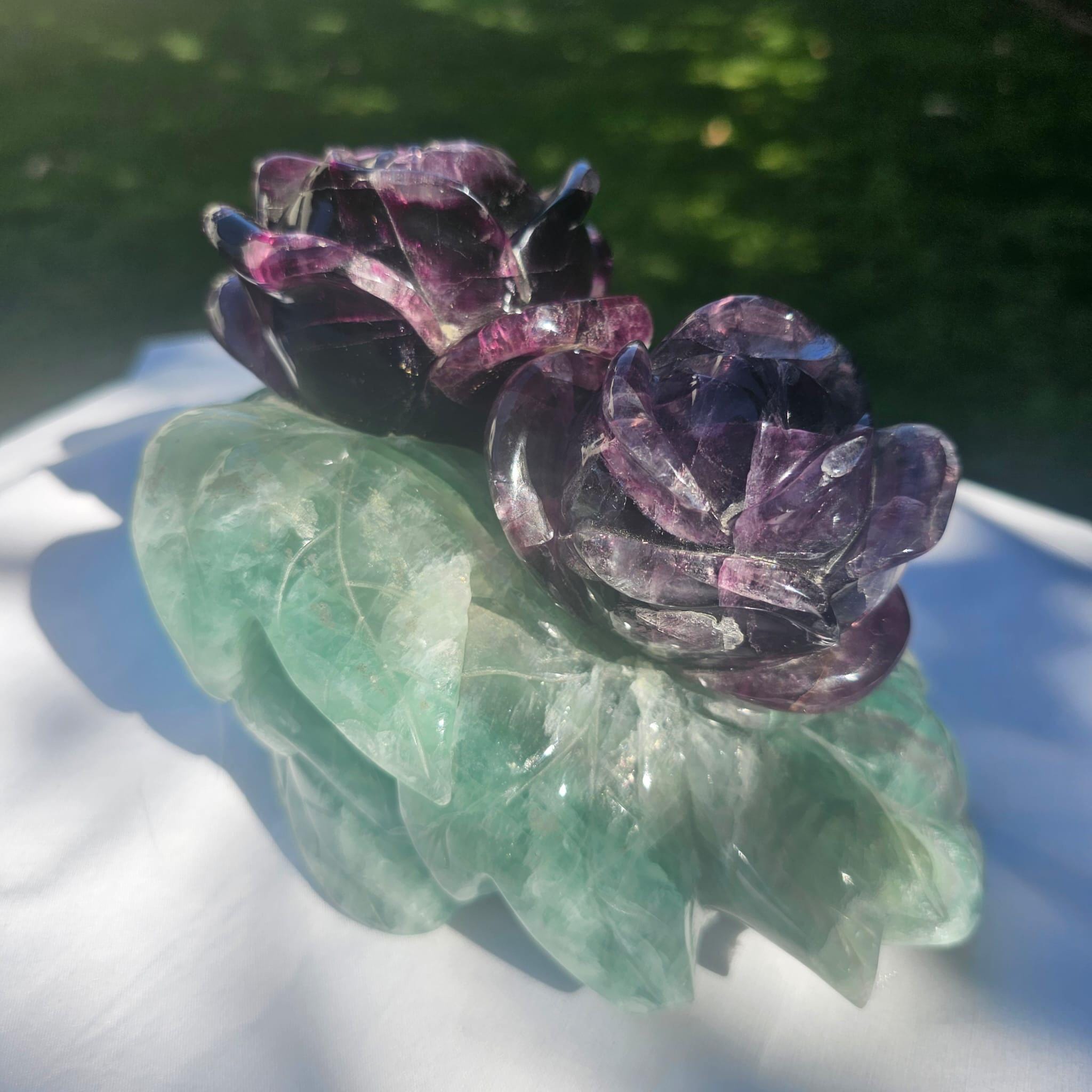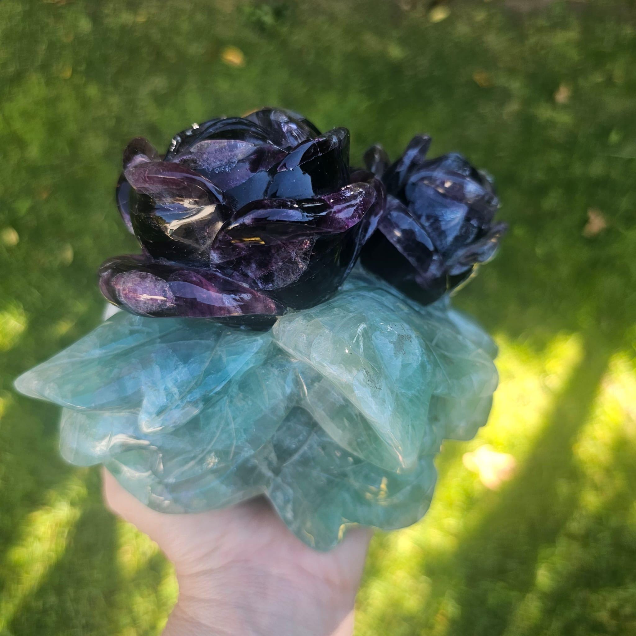 🌿 Hand-Carved Fluorite Rose Crystal Sculpture – Natural Purple & Green Gemstone Décor & Healing Gift