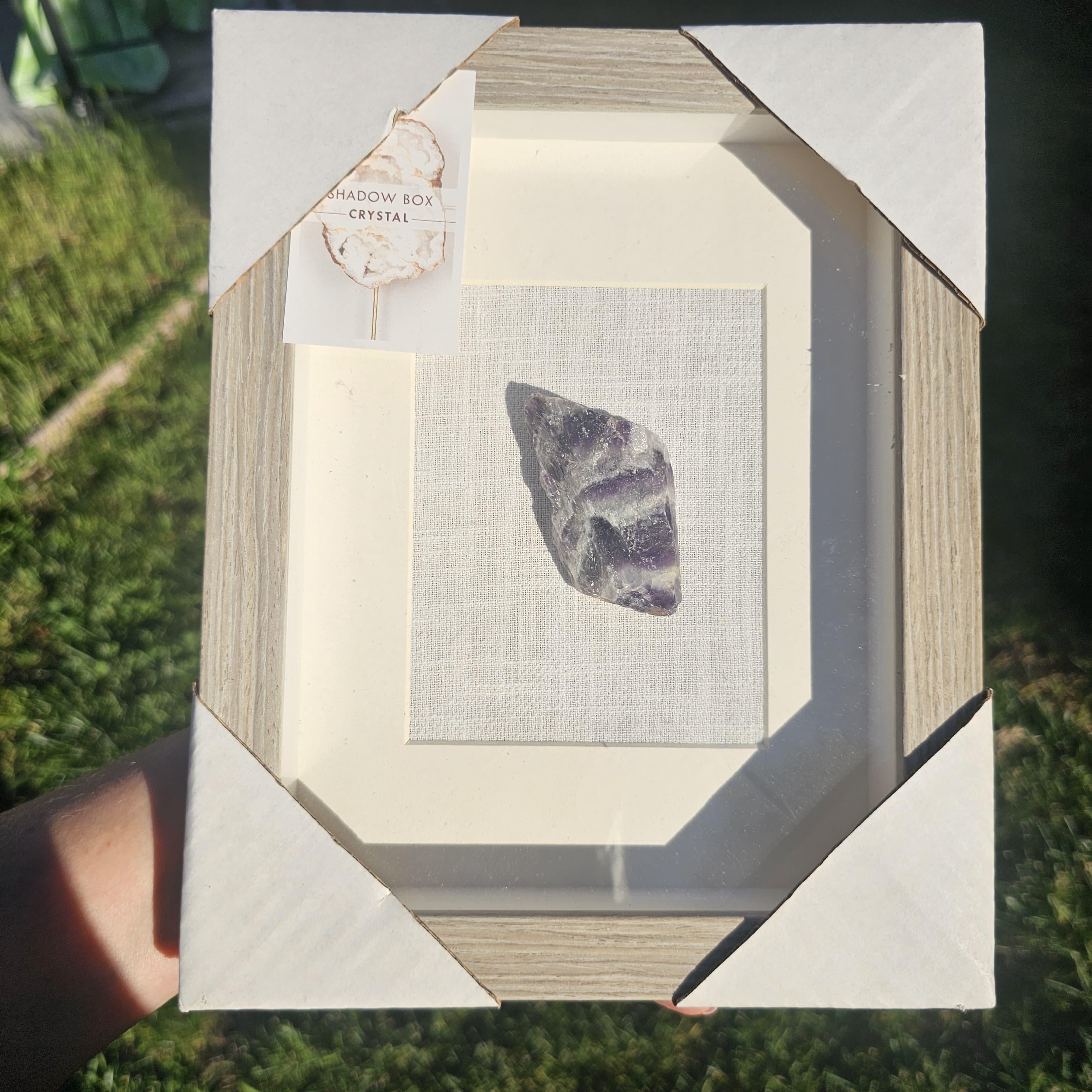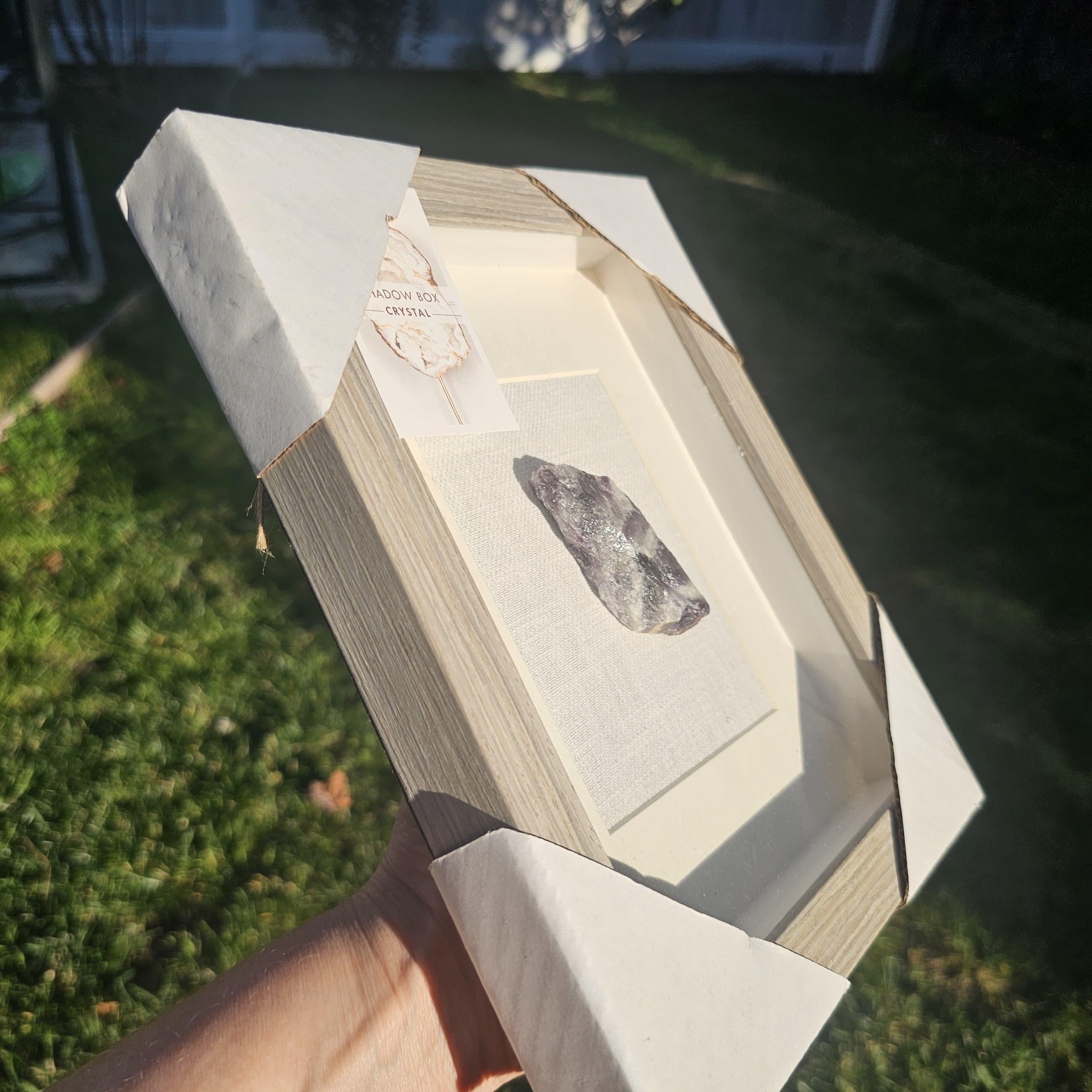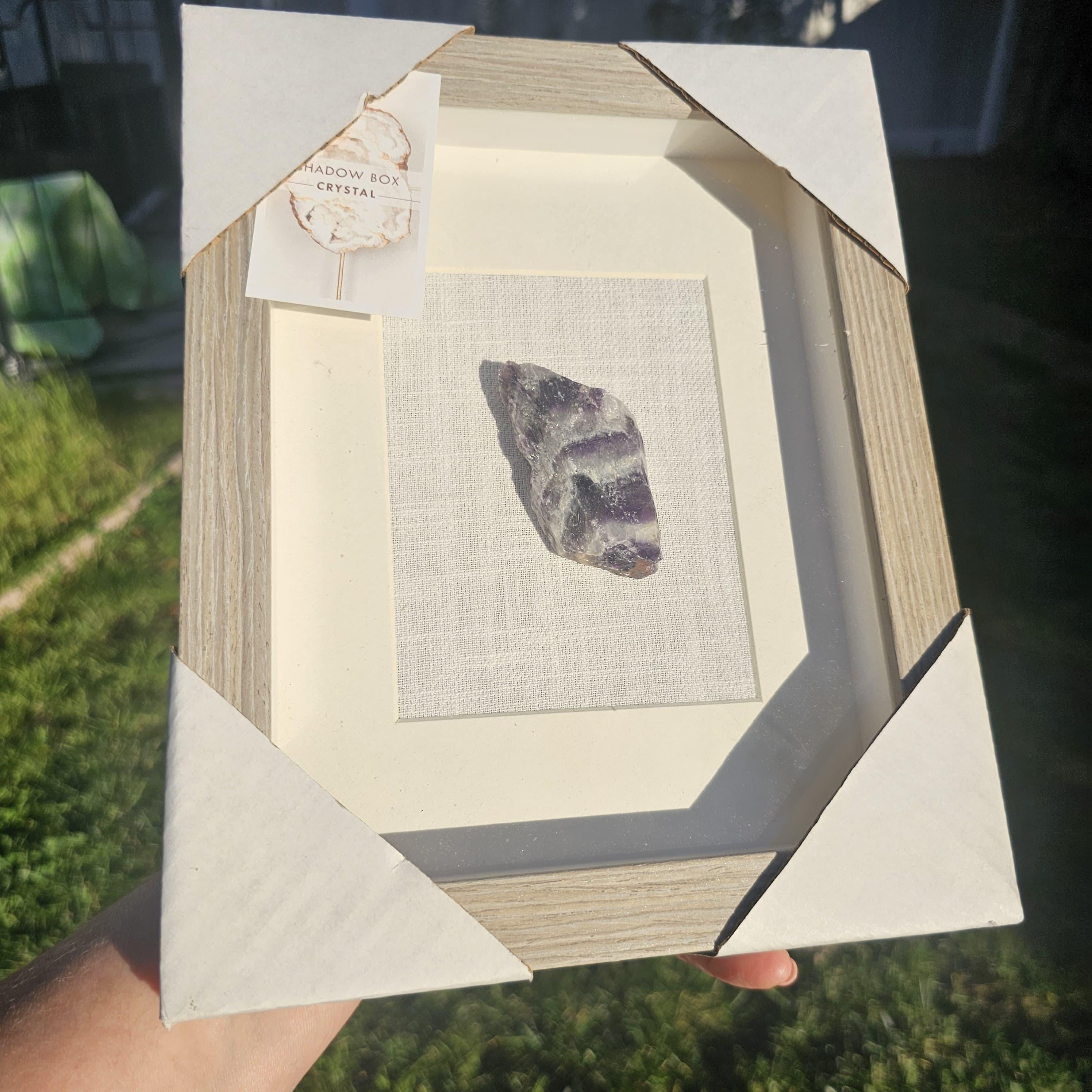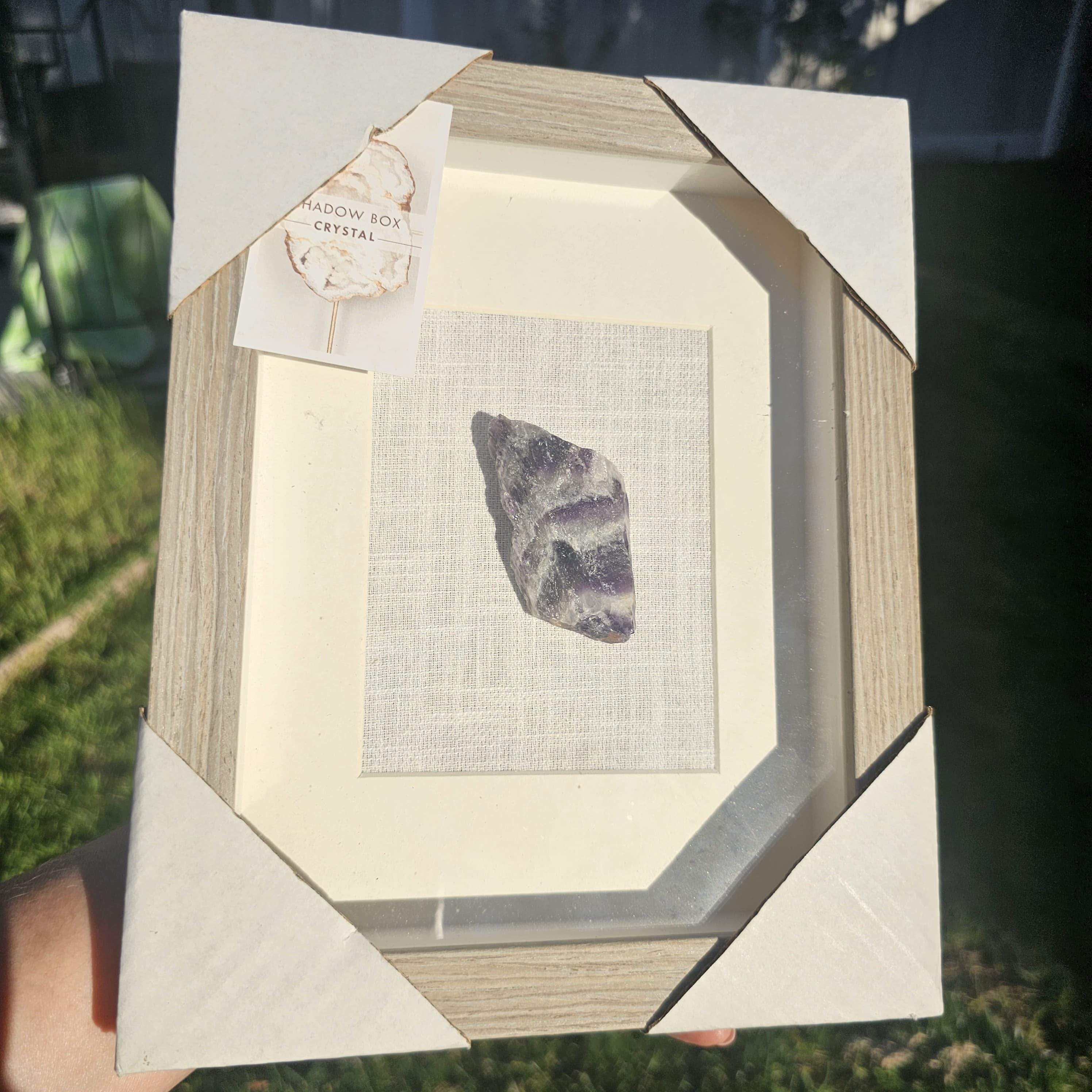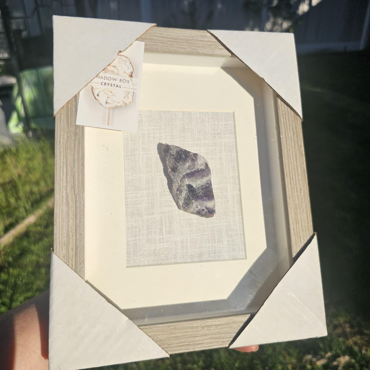 Encased in a sturdy wood frame with a glass front, this shadow box offers both protection and a refined aesthetic—perfect for showcasing the crystal as a piece of wall art or shelf décor. Each amethyst is one-of-a-kind, meaning no two pieces will ever be exactly the same.