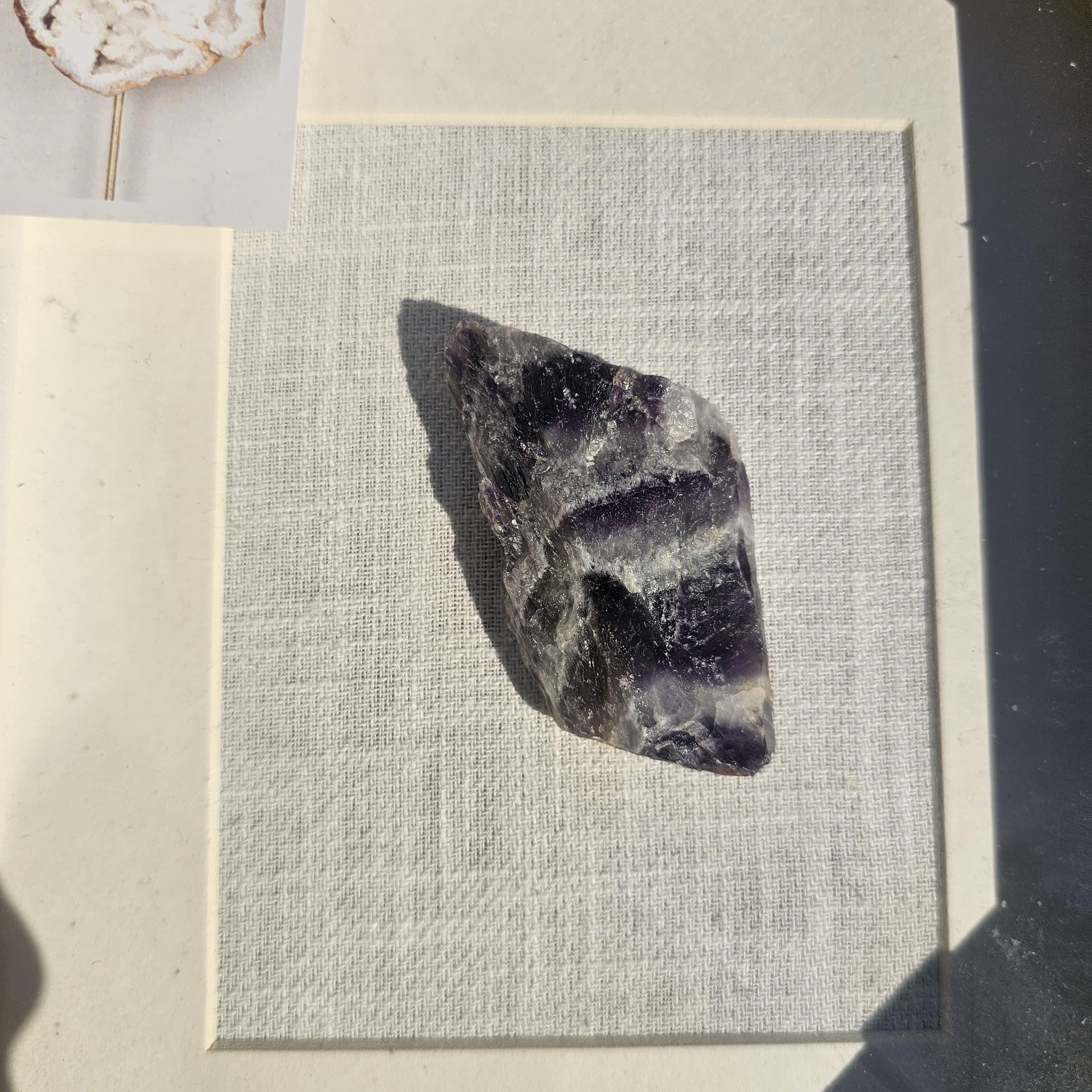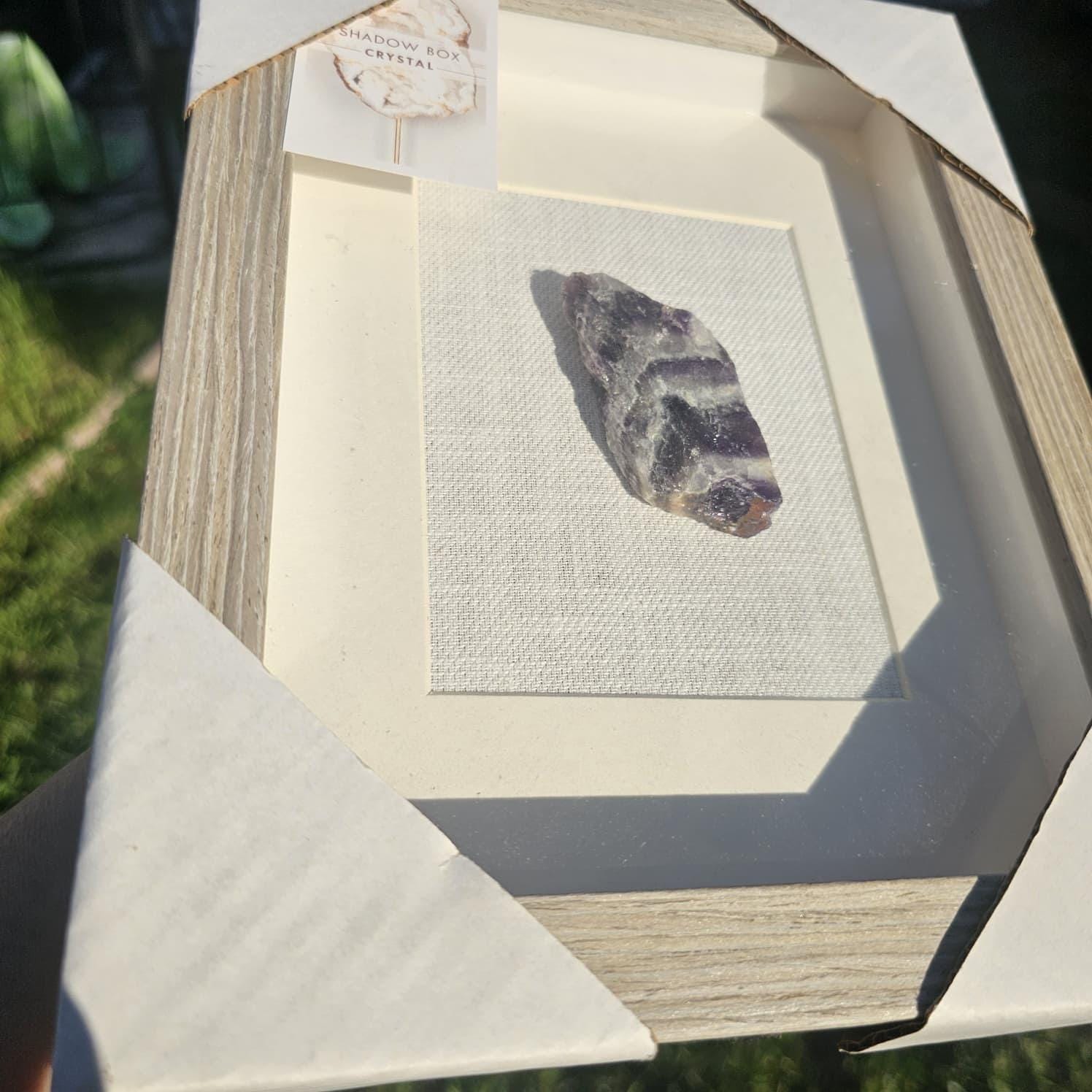 Bring a touch of natural beauty and calming energy into your space with this elegant 8x10 Amethyst Crystal Shadow Box. Featuring a genuine amethyst specimen carefully mounted on a neutral linen background, this piece highlights the raw beauty and unique banding of the crystal in a clean, modern display.