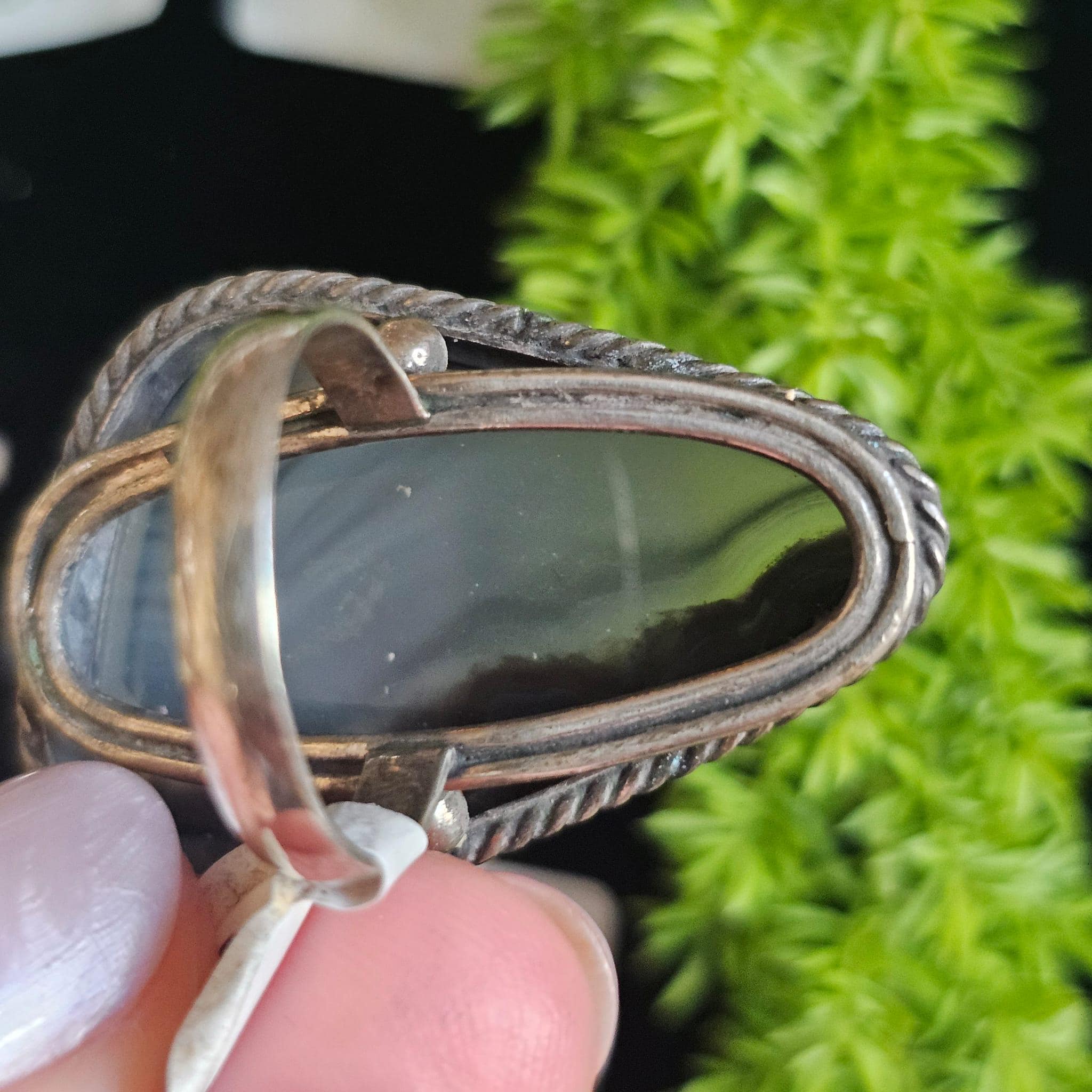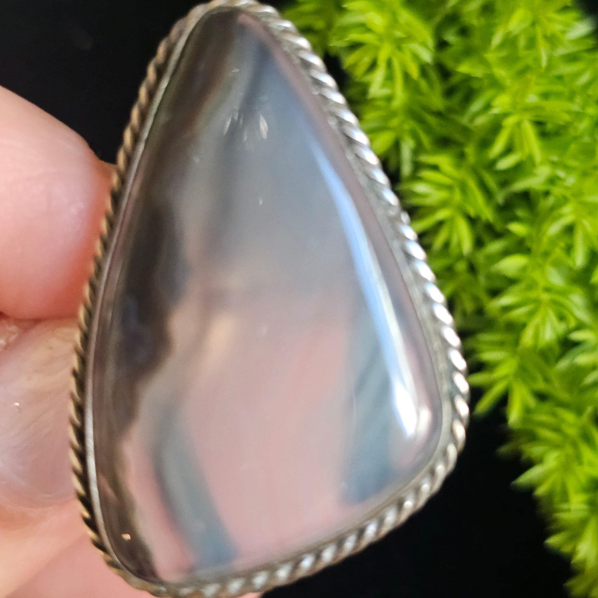 Finish: Smooth, polished stone with metal setting